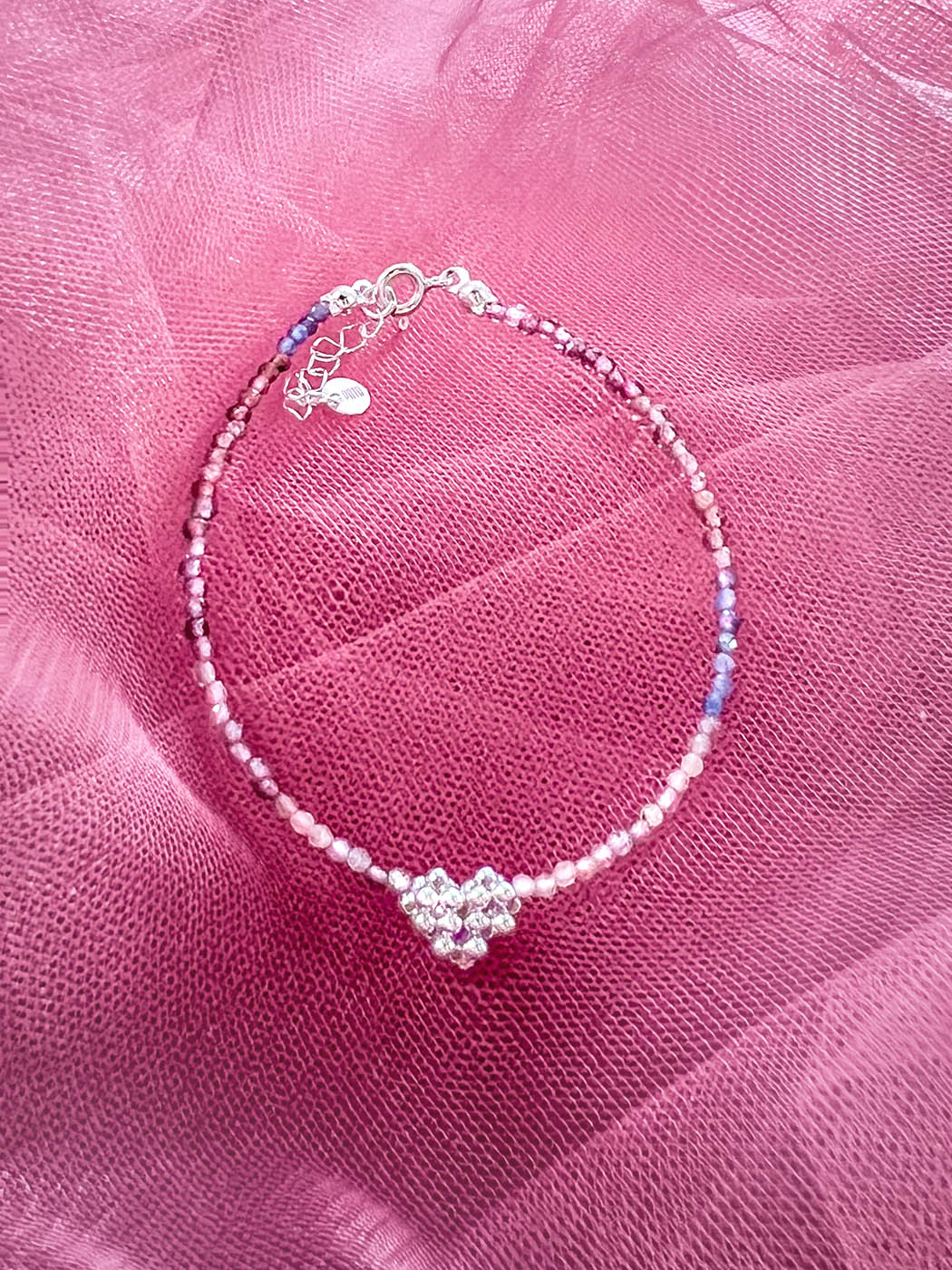 Wysoko wibracyjna bransoletka z serduszkiem, wykonana z kamieni szlachetnych/półszlachetnych*, linki jubilerskiej i srebra próby 925, opcjonalnie pozłacanego 24k złotem.